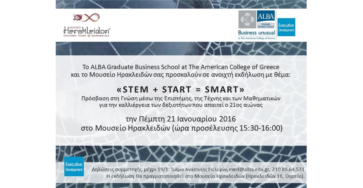 ALBA Faculty - Nikos Mylonopoulos, Associate Professor of Information Systems and Olga Epitropaki The Stavros Costopoulos Chair in Human Resource Management and Development, Professor of Organizational Behavior and Human Resources Management- and Herakleidon Museum Executives - Aris Mavrommatis, Scientific Supervisor of Herakleidon Museum and Nikos Kontoprias Executive Director of Herakleidon Museum- will engage into a dialogue in order to approach STEM and its value throughout all the phases of a person’ s life (childhood, student, adult) and will explore together how STEM interrelates with Arts and Humanities in order to co-create authenticity.