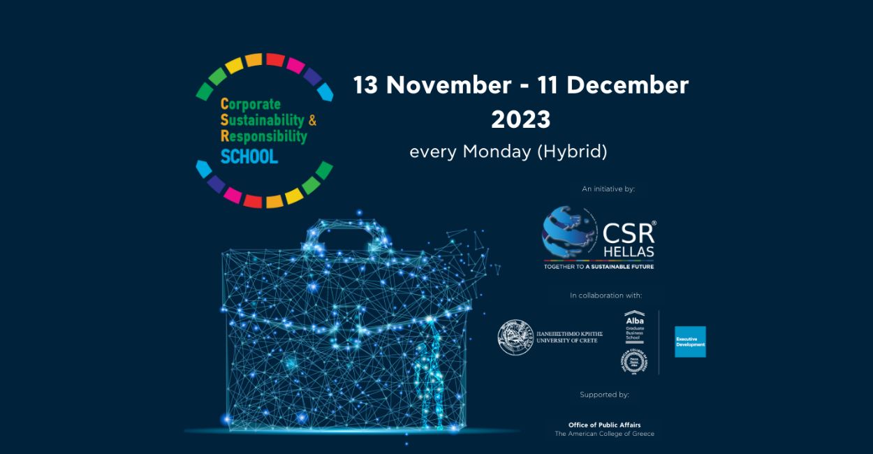 The training program is envisioned as a journey that will cover all major identified areas that relate to the responsible management of sustainability. CSR-School 2023 will take place between 13 November and 11 December on a weekly basis, during which a minimum of 40 hours of sustainability-related knowledge and management experience will be shared, trainees will gain an up-to-date overview of major developments around the largest environmental, social and governance challenges affecting businesses nowadays. This year, the CSR-School will take place in hybrid form , giving attendees – and speakers – the choice to either attend in person (location: The American College of Greece, Athens) or virtually (via Zoom).