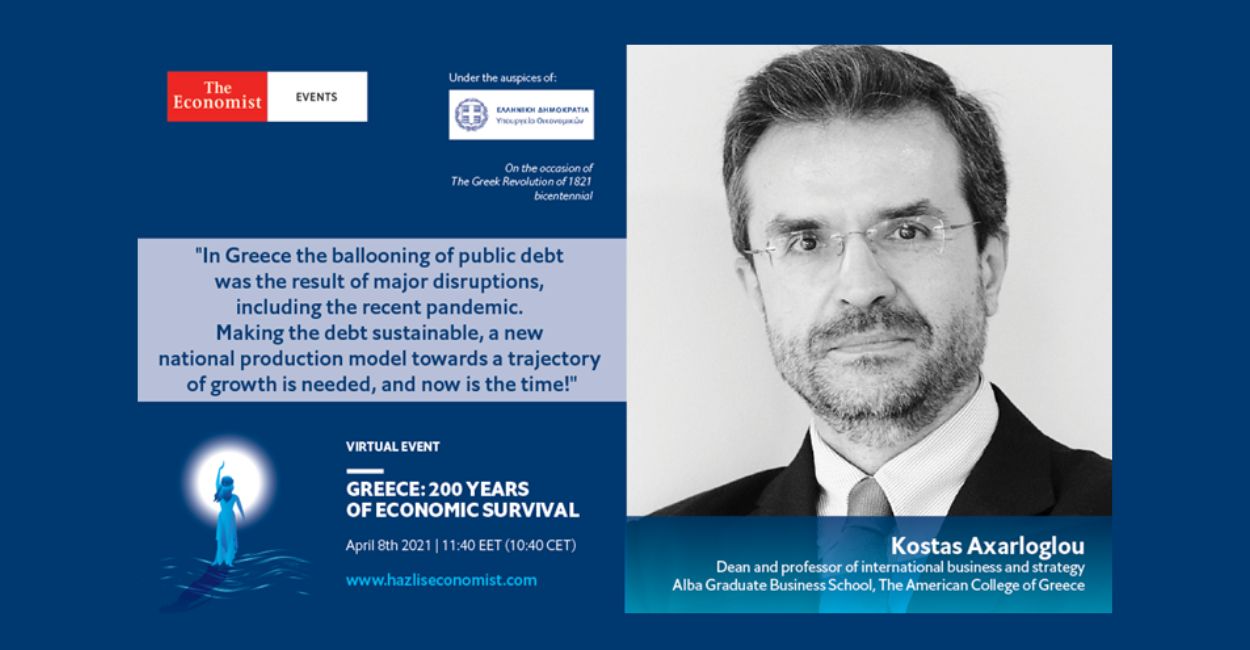 According to Dean Kostas Axarloglou, who will share his views during the panel discussion 'Greek Public Debt: A tale of two centuries' , “ In modern history of Greece in most of the cases the ballooning of public debt, and the fiscal default that followed, was the result of a major disruption in the country: to finance the Greek Revolution (1826), to build an army and infrastructure (1893) to manage the refugee inflows from Asia Minor and the Great Depression (1932). The COVID-19 pandemic has boosted again public debt, the result of an effort to support the society in managing the pandemic. The way forward in making the public debt sustainable is a new production model for the country that will bring it in a sustainable growth trajectory. And now is the time!”
