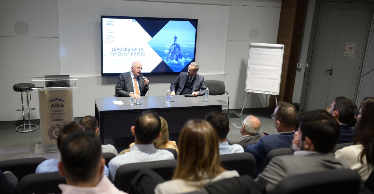 The event opened with remarks from Professor Kyriakos Kyriakopoulos, Academic Director of the Executive MBA program, who underscored the importance of leadership and lifelong learning in navigating challenging situations. The discussion was skillfully moderated by Mr. Kostas Axarloglou, Dean of the Alba Association.