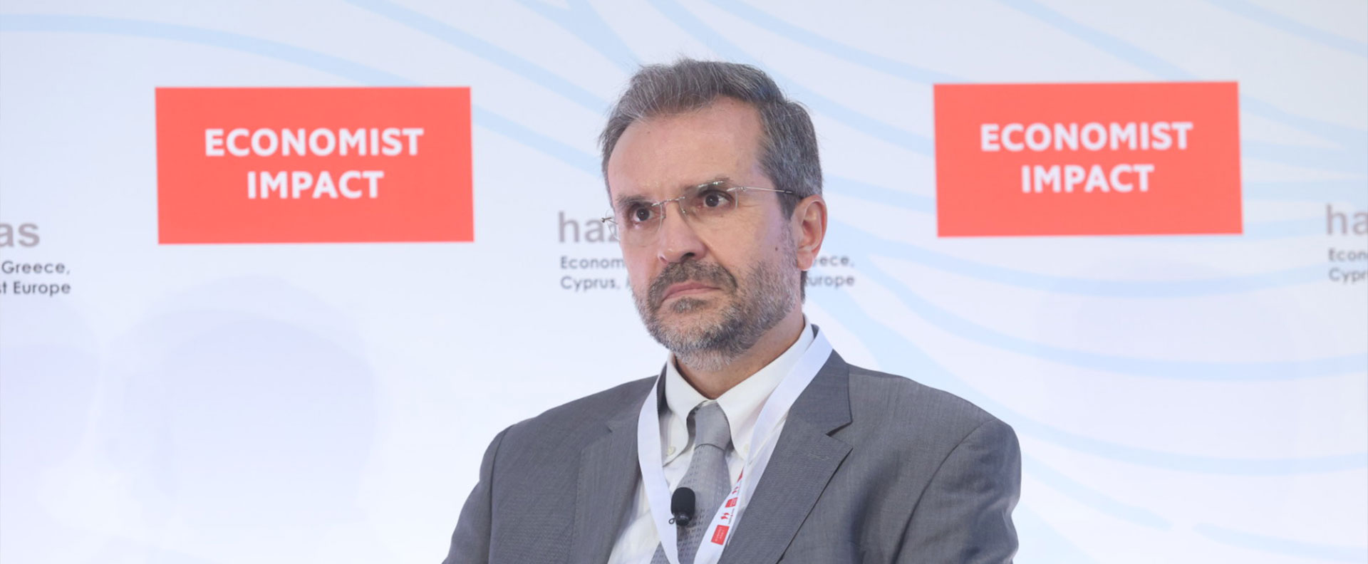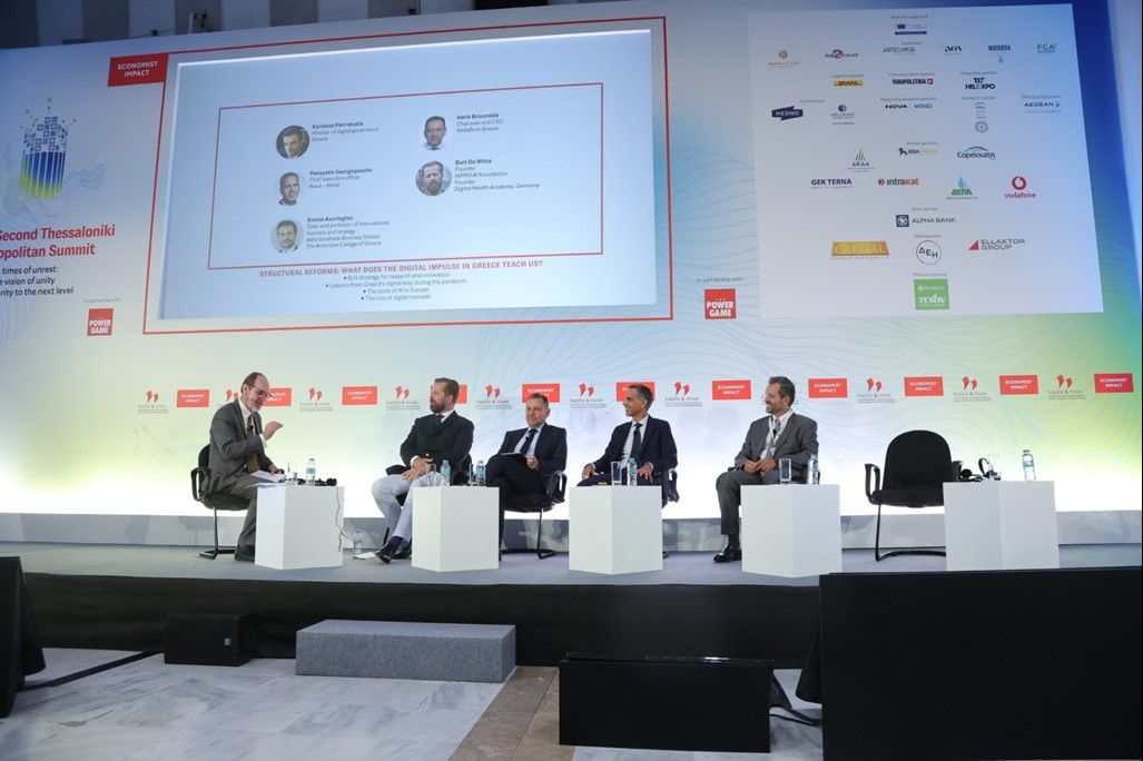 Dr. Axarloglou participated in a roundtable discussion on "The Irrelevance and the Relevance of Location," which took place on the second day of the conference. His fellow panelists were Kyriakos Pierrakakis, Minister of Digital Governance, Greece; Haris Broumidis, Chairman & CEO, Vodafone Greece; Panayotis Georgiopoulos, Chief Executive Officer, Nova – Wind, and Bart De Witte, founder, HIPPO AI Foundation, founder, Digital Health Academy, Germany.