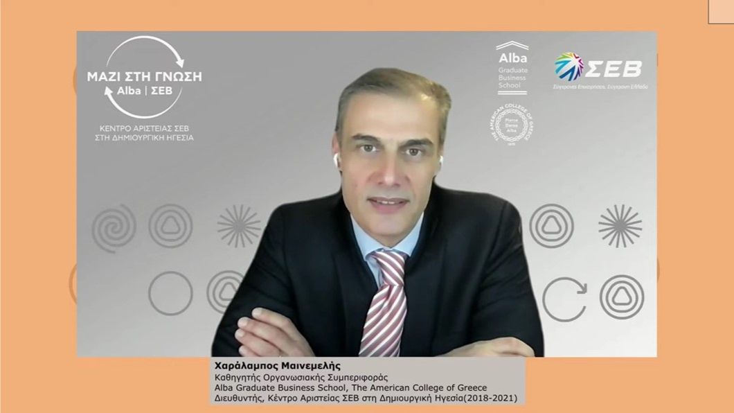 Dr. Kostas Axarloglou, Dean of Alba, and Dr. Nikos Mylonopoulos discussed the Center’s research agenda for 2022 as well as the biggest challenge for creative leaders today. These executives need to manage difficulties while creating a reconciliatory culture to promote innovation. Both speakers underlined the tremendous importance of research, as it contributes substantially to the redesign of organizations and the adaptation of businesses and leaders to the digital age.