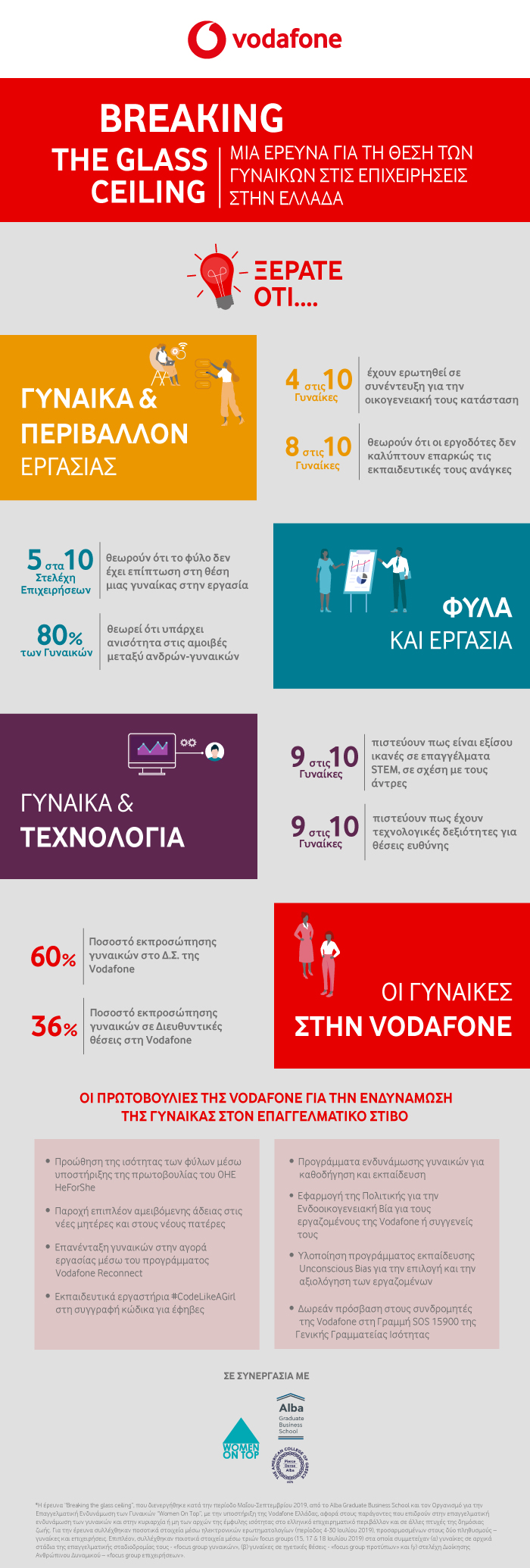 The “Breaking the Glass Ceiling” research project, a Vodafone initiative, was conducted by Alba Graduate Business School – in cooperation with the “Women on Top” organization – with the goal to map the existing landscape of equal opportunities in the Greek corporate environment and provide data, ideas and policy recommendations for the advancement of the position and the role of women in the current workplace